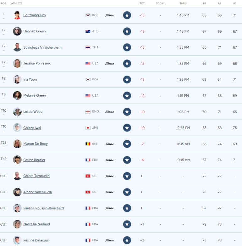 Son par au 18 se veut rassurant, tout en permettant à la joueuse de l’année 2020 de conserver deux coups d’avance sur Hannah Green, mais également l’Américaine Jessica Porvasnik, la débutante thaïlandaise Suvichaya Vinijchaitham et la jeune Sud-Corénne Ina Yoon, toutes les trois à la conquête de leur première victoire. Sur le podium lors des deux premiers tours, la Japonaise Chizzy Iwai signe la pire carte du top 50 (75) pour dégringoler au dixième rang, aux côtés de la pépite anglaise Lottie Woad qui signe la carte du jour de ce moving day (67).