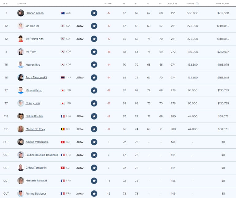 Sans véritablement craquer (un bogey au 12 et au 17 et un birdie au 15), son bogey du 17 a ouvert la porte à Green, qui s’est engouffrée dans la brèche. Jin Hee Im, vice-débutante de l’année 2024 de 27 ans, s’est invitée en playoff grâce notamment à son eagle au 16. Mais il n’y aura pas de deuxième victoire en carrière pour elle, qui regrettera forcément ce point de pénalité reçu la veille pour jeu lent. Deux autres Sud-Coréennes, Ina Yoon (-16) et Haeran Ryu (-14), terminent dans le top 5. Hanna Green est d’ailleurs la seule joueuse non-Asiatique du top 8.