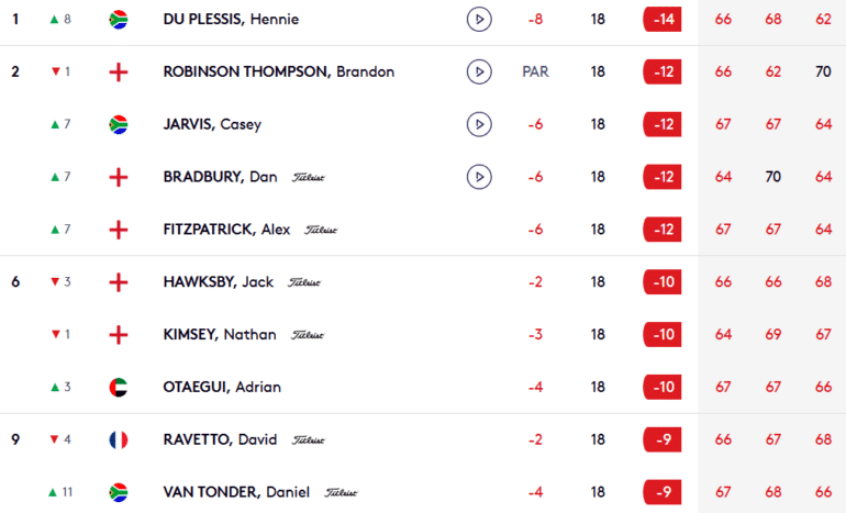 Autant dire qu’en trônant ce samedi soir seul en tête à -14 (196) grâce à une sublime carte de 62 (-8) avec notamment sept birdies claqués du trou 8 au trou 17, Hennie Du Plessis, à la recherche d’un premier succès sur le DP World Tour, sera l’homme à battre ce dimanche au Houghton Golf Club de Johannesburg.