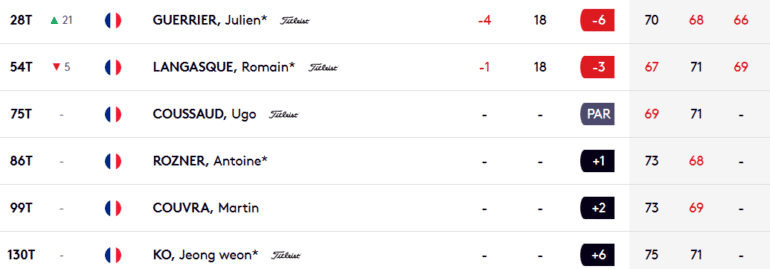 Il demeure néanmoins plus que jamais dans le coup pour la gagne, tout comme les joueurs positionnés dans le top 10, à cinq coups du leader. Citons ici l’Emirati Adrian Otaegui, sixième à -10 ou encore David Ravetto, neuvième à -9. Le Français a joué 68 (-2) dans ce Moving Day et conserve ainsi encore une petite chance de renouer avec la victoire, un an et demi après son triomphe en République tchèque. C’est en tout cas une belle bouffée d’oxygène pour le Racingman dont le meilleur résultat depuis le début de la saison 2025-26 est une… 24e place au Bahraïn Championship.