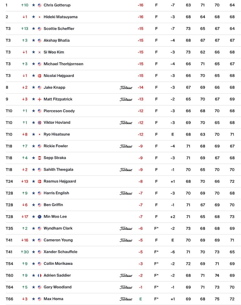 L’Américain avait enregistré cinq birdies sur les six derniers trous, rendant la meilleure carte du jour : 64 (-7). Tout comme Scottie Scheffler, ce qui lui a permis de rejoindre à la troisième place ses compatriotes Akshay Bhatia et Michael Thorbjornsen, le Sud-Coréen Si Woo Kim et le Danois Nicolai Højgaard. Inespéré, compte tenu de son entame de tournoi !