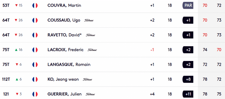 Cela passe aussi pour Martin Couvra, 53e dans le par total après deux cartes de 70 (-1) et 72 (+1), ainsi que pour Ugo Coussaud et David Ravetto, tous deux 64es à +1 après avoir joué 73 (+2) dans ce deuxième tour.