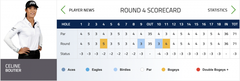 La Française, elle, reste en tête de ce classement. Sur le parcours du Colony au Texas, dont elle est membre, la n°5 mondiale a certes cédé un peu de terrain ce week-end alors qu’elle occupait la 3e position après deux tours. Ce dimanche, sa carte a été solide mais pas assez flamboyante pour qu’elle puisse jouer les premiers rôles, avec deux birdies et deux bogeys.