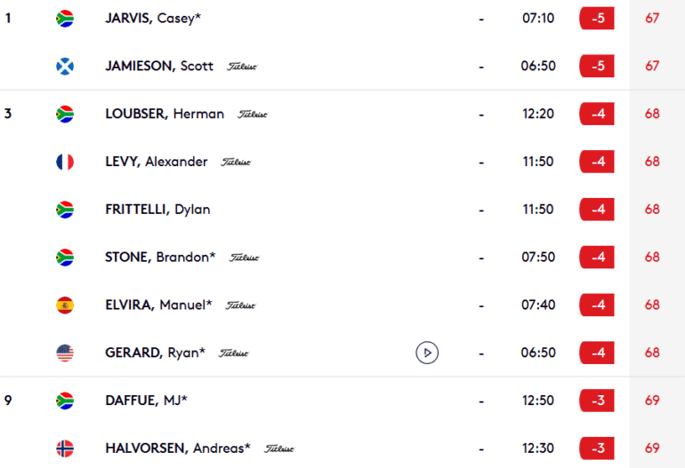 Auteurs d’une carte commune de 67 (-5), l’Ecossais Scott Jamieson, habitué à évoluer avec les éléments, et le Sud-Africain Casey Jarvis ont pris le meilleur départ. Le duo compte un coup d’avance sur six joueurs, dont le champion de l’AfrAsia Bank Mauritius Open 2017, Dylan Frittelli, Herman Loubser – actuellement deuxième au classement de l’Ordre du mérite du Sunshine Tour, qui co-sanctionne avec le DP World Tour l’événement – et Brandon Stone. Trois Sud-Africains aux dents longues.