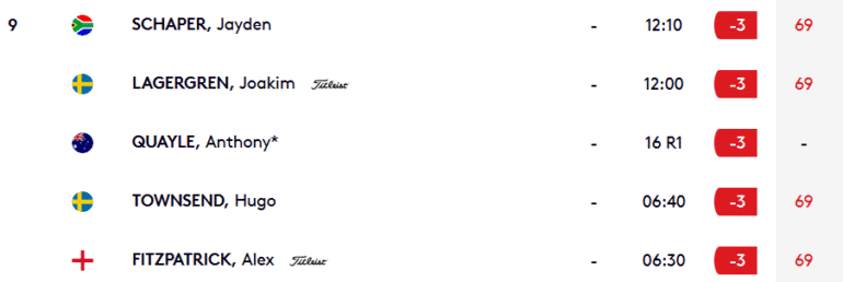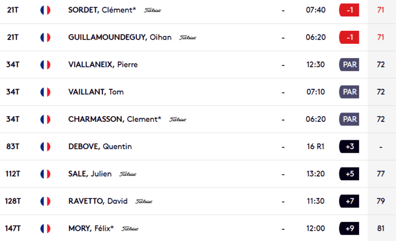 Du clan tricolore, il est le mieux classé au leaderboard devant Oihan Guillamoundeguy et Clément Sordet, 21es à -1 (71) alors que Pierre Viallaneix, Clément Charmasson et Tom Vaillant occupent la 34e place dans le par total.