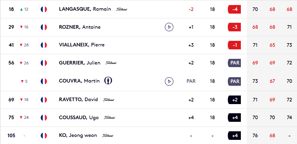 Et les Français dans tout ça ? Frédéric Lacroix au prix d’un dimanche de gala, pour donner suite à un samedi de haute volée bouclé en 64 (-6), pourrait avoir son mot à dire. Il s’élance à 5 longueurs de la tête.