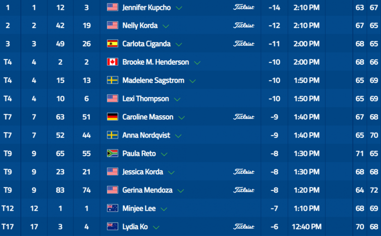 L’Espagnole Carlota Ciganda complète le podium à -11 après deux cartes de 68 et 65 (dont deux eagles ce vendredi aux trous 8 et 18). En embuscade, juste derrière, on retrouve quelques sérieuses clientes telles la Canadienne Brooke M. Henderson, deux fois victorieuse du tournoi, l’Américaine Lexi Thompson et la Suédoise Madelene Sagstrom, toutes quatrièmes à -10.