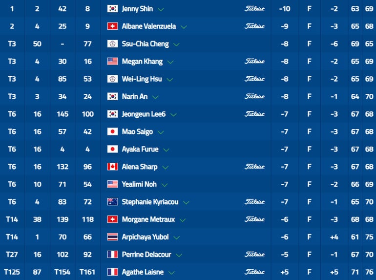 Superbe performance également de la Suissesse Albane Valenzuela qui termine sa journée seule au deuxième rang, à un coup de Shin (-9). Unique membre du top 20 à avoir mieux scoré au deuxième tour par rapport au premier (69-65), la Taïwanaise Ssu-Chia Cheng rejoint un quatuor à -8 sur la dernière marche du podium. En jouant quatorze coups de plus que la veille, la Thaïlandaise Arpichaya Yubol dégringole au 14e rang (-6).