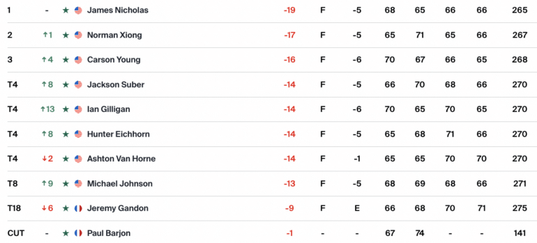 Cette journée à rallonge n’a pas perturbé James Nicholas. L’Américain a signé un eagle sur le 72e trou de la semaine pour s’imposer avec deux coups d’avance sur son compatriote Norman Xiong, auteur d’un 66 (-5) ce dimanche.