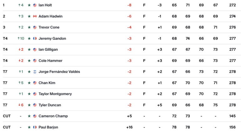 Jérémy Gandon a terminé à cinq longueurs du vainqueur, Ian Holt, auteur d’un 67 (-3) ce dimanche. L’Américain s’envole au classement général puisqu’il enchaîne une deuxième victoire consécutive après son succès aux Bahamas la semaine passée.