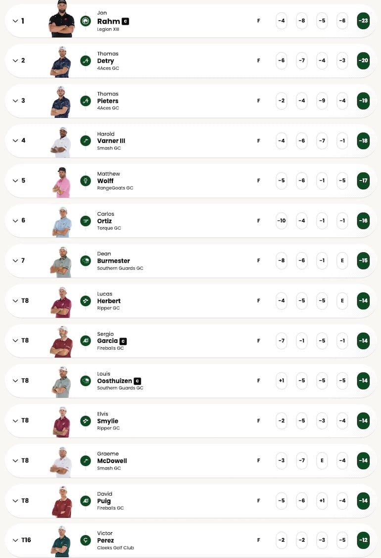 Le 4 Aces GC des deux Belges, Dustin Johnson et Anthony Kim a remporté le tournoi par équipe pour la première fois depuis 2023 (974 jours), devant le Smash GC de Talor Gooch et Legion XIII de Jon Rahm.