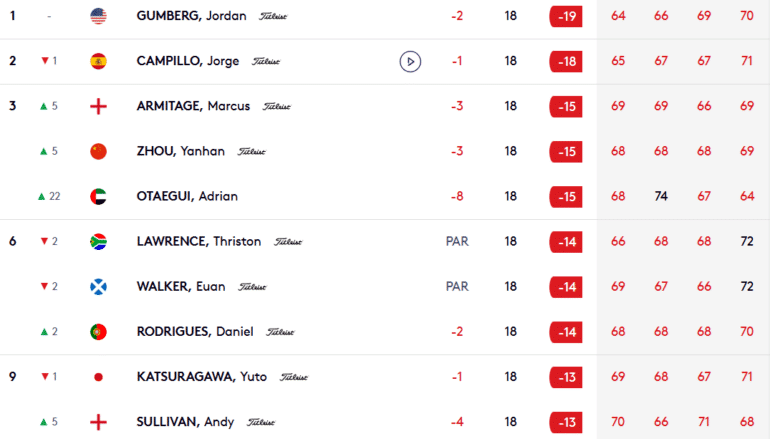 La performance du jour est à mettre au crédit du Basque Adrian Oteagui, évoluant désormais sous passeport émirati, déchainé par son 64 (-8) sans erreur (un eagle et six birdies). On peut aussi citer l’étonnant Yanhan Zhou, 17 ans, troisième avec Otaegui et Marcus Armitage. Après trois cuts manqués au Bahraïn, au Qatar et au Kenya, le jeune chinois claque ici son premier podium à -15 (273). Alors retenez bien son nom.