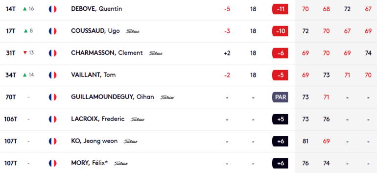A signaler aussi le beau tir groupé de Quentin Debove, 14e à -11 (277) avec également un dernier 67 posté, et Ugo Coussaud, 17e à -10 (278) en jouant 69 aujourd’hui. 2e réserve pour l’instant au Hero Indian Open, il y a néanmoins de grandes chances que le Parisien soit au départ jeudi prochain à New Delhi sur l’un des plus scéniques parcours du DP World Tour, le DLF Golf & Country Club signé Gary Player !