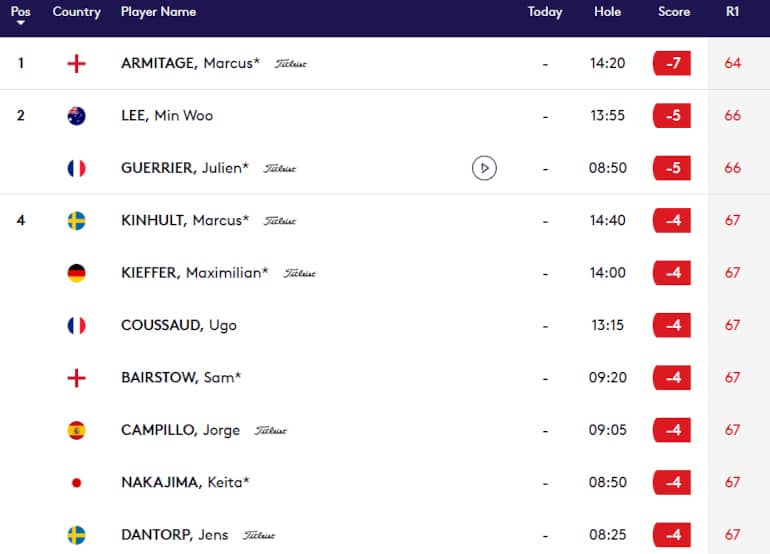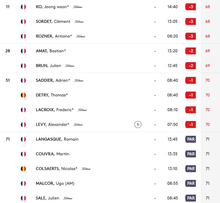 Blotti à deux coups du leader, aux côtés de Julien Guerrier, la star australienne du PGA Tour Min Woo Lee est un solide prétendant au titre. Le vainqueur du dernier Houston Open sur le PGA Tour a commencé par un birdie au 10… avant de finir par quatre birdies sur ses quatre derniers trous ! Le 43e joueur mondial est la star du top 50 qui a le mieux répondu présent après les dix-huit premiers trous, contrairement au Canadien Corey Conners (par) et surtout Harry Hall (+3). Brooks Koepka (ancien numéro un mondial dont l’actuel classement est plombé par son choix d’évoluer sur le LIV, en plus de performances décevantes) et Ryan Fox (28es, -2), voire le Belge Thomas Detry (-1) sont en embuscade.