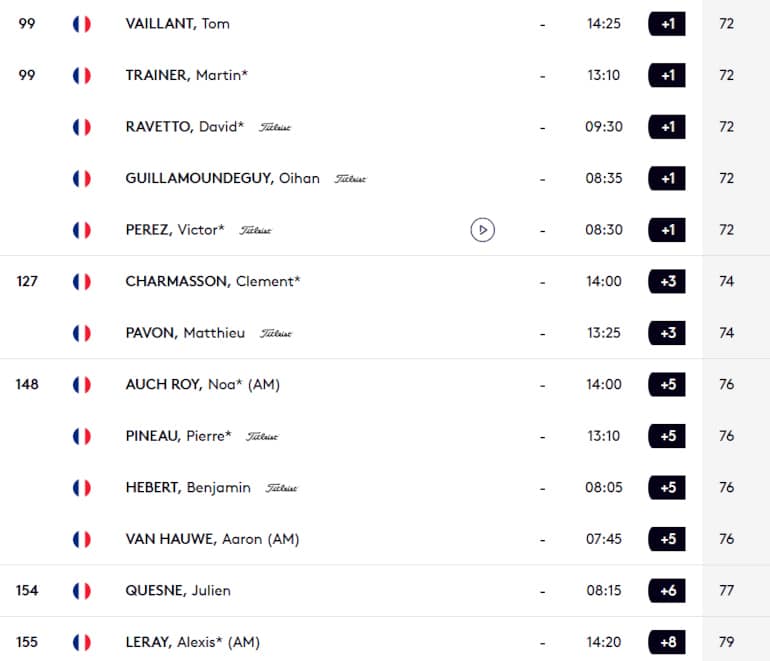 Derrière Julien Guerrier, 26 autres Français ont connu des fortunes diverses. On notera la belle prestation matinale d’Ugo Coussaud qui est au pied du podium à -4. Des trois joueurs tricolores du PGA Tour particulièrement attendus, Antoine Rozner finit dans le top 15, alors que Victor Perez (99e) et Matthieu Pavon (127e) sont passés au travers de la première journée.