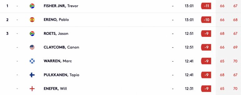 Les Français sont respectivement devancés de cinq et six longueurs par le local de l’étape, Trevor Fisher Jnr, 46 ans. L’Espagnol Pablo Enero suit à une unité. L’Ecossais Marc Warren et le Finlandais Tapio Pulkkanen sont également en embuscade à deux coups.