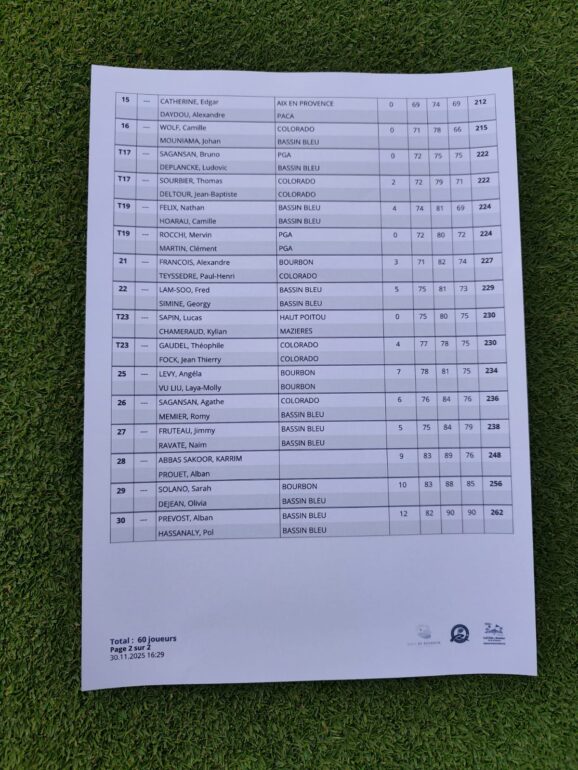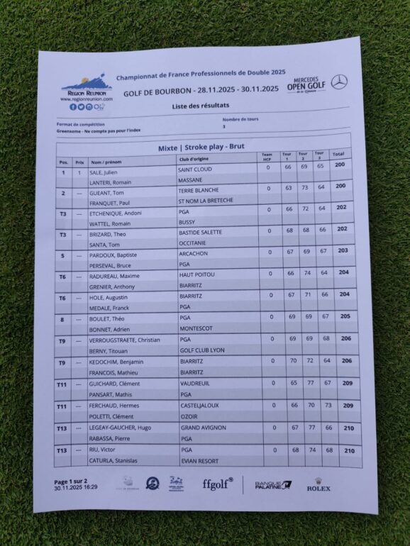 Auteurs d’une sérieuse carte de 65 (-7) en fourballs sans concéder le moindre bogey, les Réunionnais sont parvenus à éviter le piège tendu par la paire Tom Guéant–Paul Franquet, 64 (-8) aujourd’hui avec notamment un début de journée en boulet de canon : birdie du 1 au 3, eagle au 4, birdie au 5. Ces deux-là ont en effet emmené les principaux favoris cette année dans un improbable playoff (en foursome cette fois et non plus en fourballs) après avoir manqué de quelques centimètres seulement le birdie de la victoire sur le 72e trou avec ce putt finalement trop court de Tom Guéant.