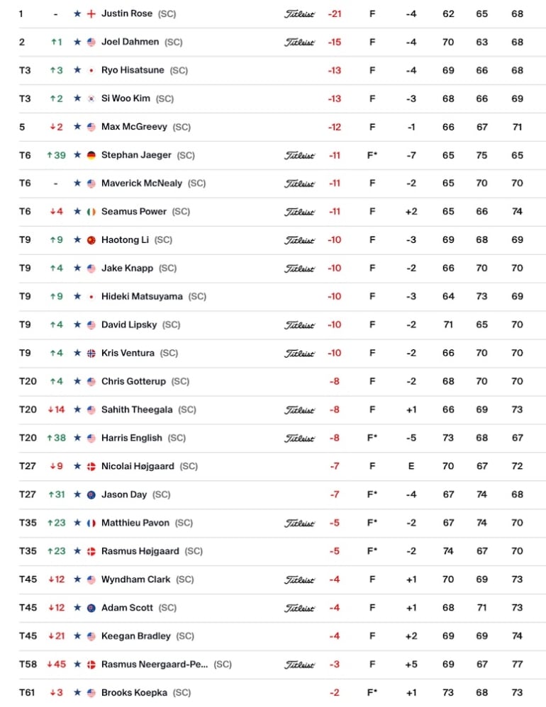Justin Rose affiche un score de -21 (195), soit la deuxième plus grande avance après 54 trous dans ce tournoi, derrière les huit coups d’avance que Tiger Woods comptait en 2008. Ce dernier a enregistré huit victoires professionnelles, dont l’U.S. Open, sur ce parcours public.