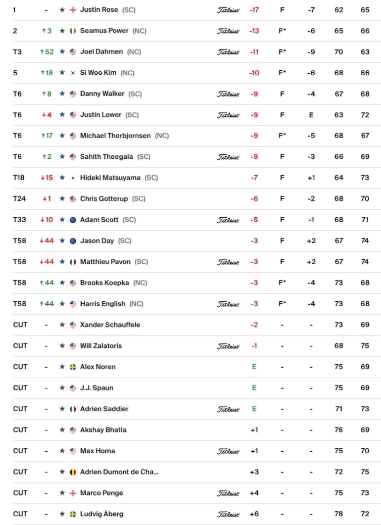 Vainqueur de l’édition 2019, Justin Rose affiche un score sur 36 trous de -17, le meilleur au Farmers Insurance Open depuis qu’il avait égalé le record (-15) en 2019. Son total de 127 est à un coup seulement de son meilleur score sur deux tours en carrière (Travelers Championship 2010).