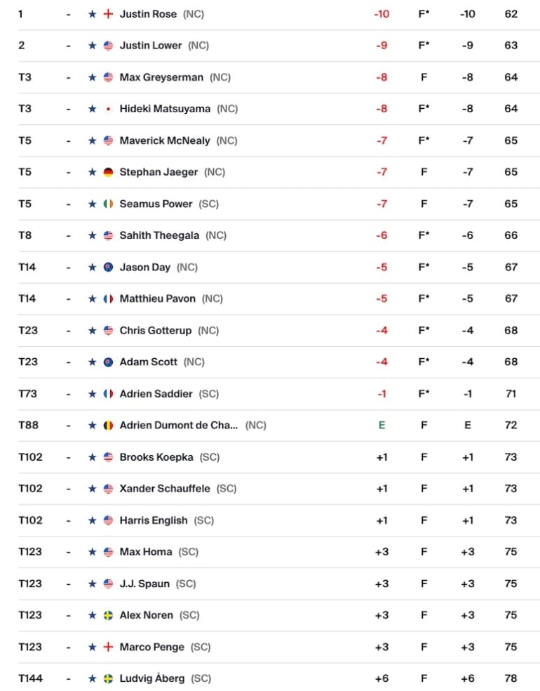 C’est mieux par exemple qu’Adrien Dumont de Chassart et Tony Finau, pourtant auteur du premier trou en un de la saison (72), Brooks Koepka, Xander Schauffele et le tenant du titre Harris English (73), J.J. Spaun, Max Homa et Marco Penge (75) ou encore Ludvig Aberg (78).