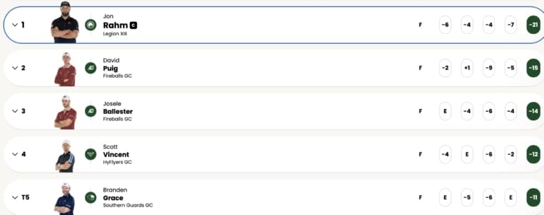 Jon Rahm remporte son troisième LIV Golf Mexico consécutif. L’Espagnol, qui a conclu ce sixième rendez-vous de la saison en postant une carte de 64 (-7), signe un -21 semaine. L’Espagne tout en haut du leaderboard ! Rahm a en effet devancé ses deux compatriotes, David Puig et Josele Ballester, relégués respectivement à 6 et 7 coups. Après un splendide 62 (-9) jeudi en ouverture de l’étape mexicaine, Victor Perez a lui par la suite marqué le pas malgré un sursaut ce dimanche avec une carte de 69 (-2, -7 total).
