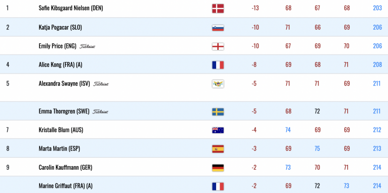 Avec son 71 (-1) lors du dernier tour, Alice Kong termine quatrième à cinq points de la vainqueur, la Danoise Sofie Kibsgaard Nielsen, déjà leader du général avant ce tournoi.