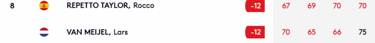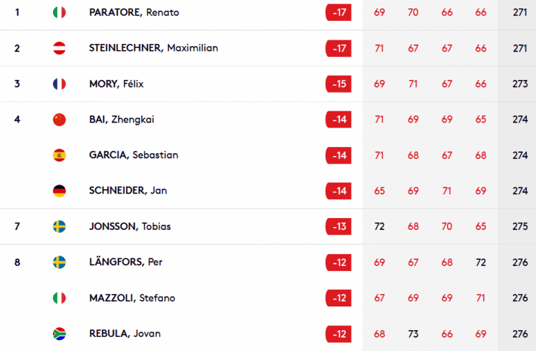 Le troisième homme de la partie, et leader des deux premiers tours, l’Allemand Jan Schneider signe son premier top 10 sur le circuit secondaire européen. Sa dernière carte de 69 lui offre même une quatrième place ex aequo aux côtés du Chinois Zhengkai Bai, auteur de la carte du jour en 65, et de l’Espagnol Sebastian Garcia.