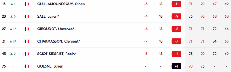 Le premier Français de la semaine est le Nordiste Félix Mory, auteur d’une dernière journée en 66 pour grimper seul à la troisième place, à seulement 2 coups des leaders. Avec ces gros points inscrits sur l’avant-dernier tournoi de la saison régulière, il grimpe à la dixième place de la Road to Mallorca. Le N°1 Français à la Race, le Landais Oihan Guillamoundeguy termine à une honorable treizième place ex aequo, à un coup du top 10 aux côtés de l’Américain Davis Bryant. Il perd deux places à la Race mais reste cinquième. Un troisième Français se hisse dans le top 20 : Julien Sale.