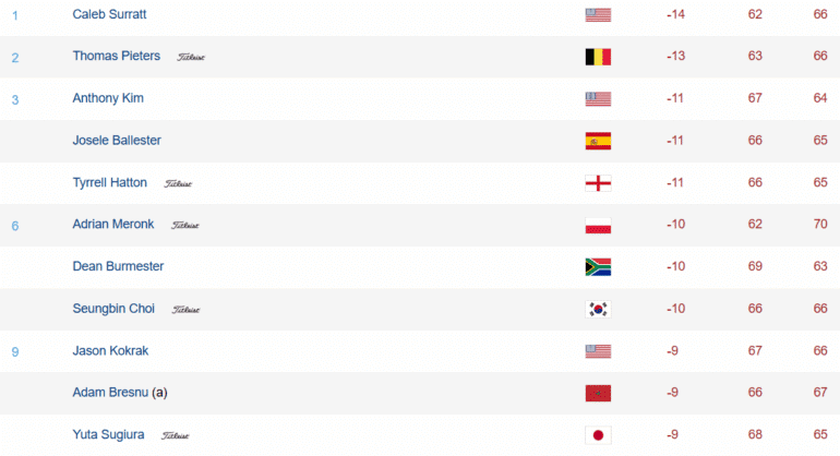 Grâce à une solide carte de 66 (-5) et un score de -14 (128), Surratt prend cette fois seul les commandes du tournoi (il était co-leader mercredi soir avec le Polonais Adrian Meronk) devant le Belge Thomas Pieters (-13).