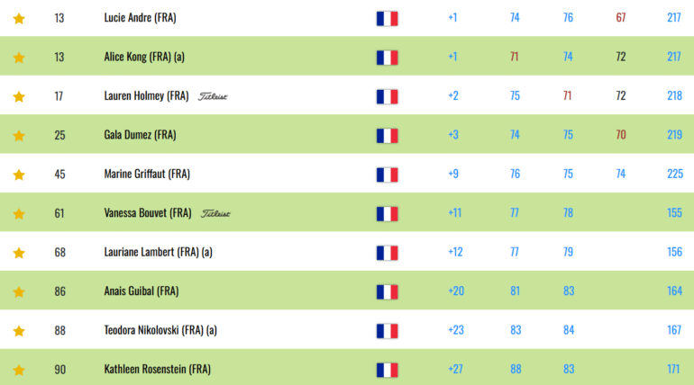 Les Françaises ont fait un bon début de saison avec trois top 20. Parmi ces bonnes performances, celle de l’espoir Alice Kong, 16 ans et déjà victorieuse sur le LETAS. La Francilienne termine 13e ex aequo en +1 total, aux côtés de son ainée, Lucie André (38 ans), auteure d’une des cartes du jour (67). Elles terminent à un coup du top 10.