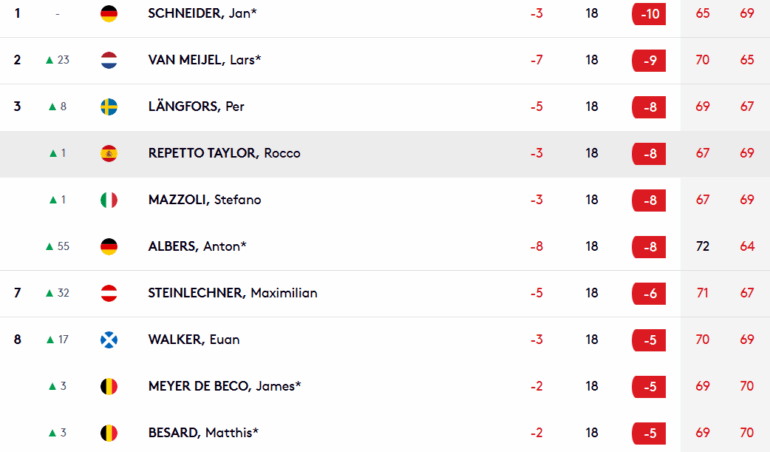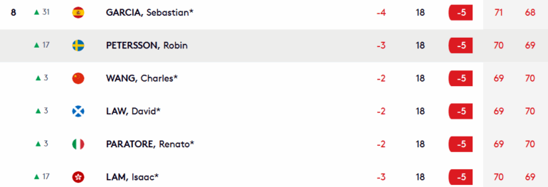 Le top 10 compte quinze joueurs, dont les doubles vainqueurs de la saison l’Italien Renato Paratore et l’Ecossais David Law huitièmes ex aequo en -5. À l’instar du Sud-africain J.C.Ritchie, ils tenteront de décrocher un troisième titre, synonyme d’ascenseur automatique pour le DP World Tour.
