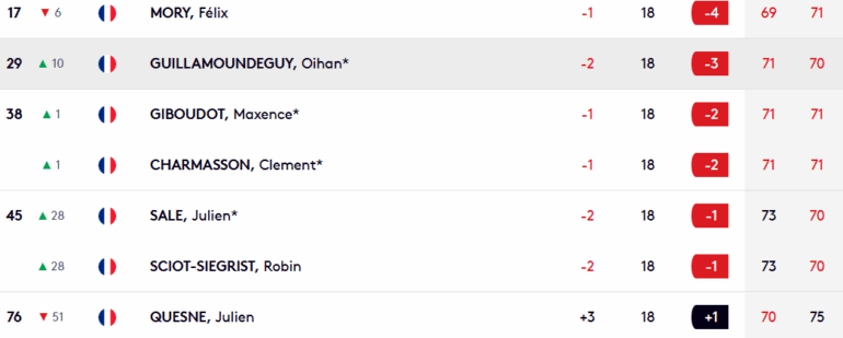 Maxence Giboudot et Clément Charmasson signent chacun leur deuxième carte de 71 et se positionnent 38es. Julien Sale et Robin Sciot-Siegrist seront là ce week-end après deux cartes de 73 et 70. Ils franchissent le cut sur la marque de -1. Seul éliminé, Julien Quesne a été plombé par sa première moitié de parcours : 4 bogeys après 11 trous. Malgré deux birdies au 15 et au 17, le bogey du 18 a douché définitivement ses minces espoirs.