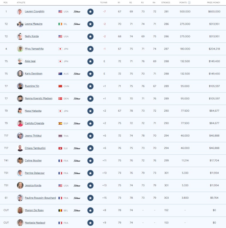 L’Irlandaise Leona Maguire a profité de la mauvaise journée de Nelly Korda pour rejoindre la numéro deux mondiale au classement, avec son premier podium tous circuits confondus depuis plus de deux ans et un probable retour dans le top 100 mondial. La Japonaise Miyu Yamashita termine au pied du podium avec le quatrième score sous le par de la semaine seulement ! Avec une magnifique carte finale de 67 sur le terrible parcours de Shadow Creek, la Chinoise Ruoning Yin arrache une place dans le top 10. La numéro un mondiale thaïlandaise Jeeno Thitikul se contente de la 17e place, aux côtés de la Suissesse Chiara Tamburlini