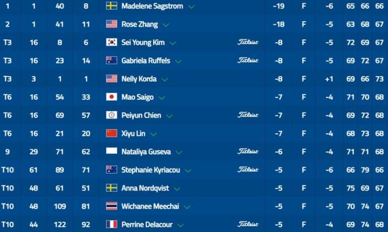 Revenue à quatre coups des leaders Sagström et Zhang après 36 trous en signant un superbe 66 sans bogey, l’Américaine, en quête d’un sixième succès d’affilée cette saison, est, hélas, passée à côté de sa journée, se contentant d’un 73 (+1) lesté par quatre bogeys contre trois birdies. Elle n’effacera donc pas du livre des records du LPGA Nancy Lopez et Annika Sörenstam, elles aussi cinq fois victorieuses consécutivement dans une saison.