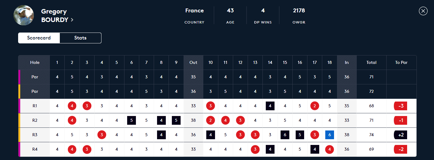 Le premier enseignement de ces quatre jours des cartes est aussi un constat amer pour neuf des onze tricolores engagés dans ce marathon qui s’arrête avant d’avoir franchi la ligne d’arrivée. L’espoir de retrouver le DP World Tour s’envole pour le quadruple vainqueur sur le Tour, Grégory Bourdy, pour un tout petit coup de golf. En -4 total, il manque le cut au 74e rang, tout comme son compère d’expérience, Julien Quesne, deux fois vainqueur sur le Tour européen dans les années 2010.