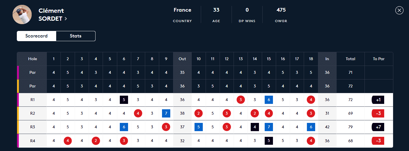 Pas plus de réussite pour le gaucher Robin Sciot-Siegrist (88e), Romain Wattel (99e), Robin Roussel (114e) et Clément Sordet (127e). Maxence Giboudot ferme la marche des joueurs tricolore en 135e position. Ils se consoleront en gagnant ou en conservant le cas échéant, une catégorie de jeu sur l’HotelPlanner Tour (ex-Challenge Tour) l’an prochain.