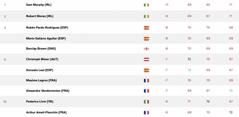 Loin du leader à mi-parcours, Robert Moran, lui aussi Irlandais, est totalement revenu dans la course avec quatre birdies sur le retour. Il a finalement terminé à deux coups de Murphy après un dernier bogey au 18. Les Espagnols Ruben Pardo Rodriguez et Mario Galiano Aguilar, ainsi que l’Anglais Barclay Brown, se sont partagés la troisième place, à trois coups du vainqueur. Le dernier nommé était revenu à hauteur du leader avant de perdre trois coups sur les trois derniers trous avec un bogey au 16 et un double au 18.