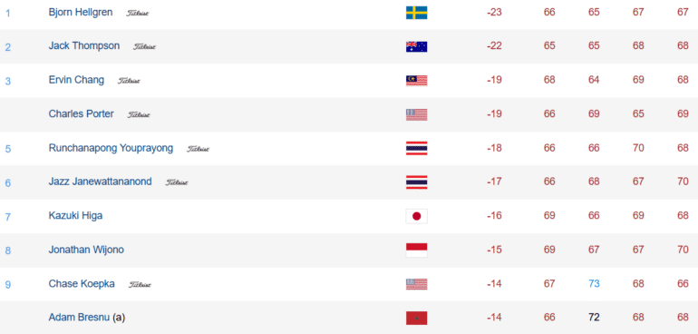 Septième à -16, Kazuki Higa termine de son côté n°1 de ce même ordre du mérite devant le Zimbabwéen Scott Vincent. Ce dernier, quinzième ex aequo, se devait de finir… deuxième pour détrôner le Japonais. Il se consolera avec sa place de n°1 des International Series rankings, ce qui lui ouvre les portes du LIV Golf 2026 (avec le Japonais Yosuke Asaji).
