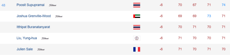 Auteur de quatre tours sous le par (71, 70, 71, 70), Julien Sale, le seul Français présent cette semaine en Arabie saoudite, se contente de la 48e place à -6. Le récent vainqueur du Championnat de France professionnel de double à La Réunion (avec son compère Romain Lanteri) achève sa saison sur l’Asian Tour à la 34e place de l’ordre du mérite. Sa victoire le 26 janvier aux Philippines lui assurait de toute façon sa présence en Asie en 2026.