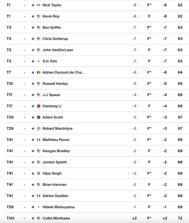 Effectivement, les joueurs de l’après-midi ont été moins gâtés avec l’anémomètre qui est monté en fin de journée. Seuls quatre joueurs du top 16 provisoire ont joué l’après-midi. Parmi eux figure l’un des favoris du tournoi, Ben Griffin, auteur d’un très bon 63 (-7).