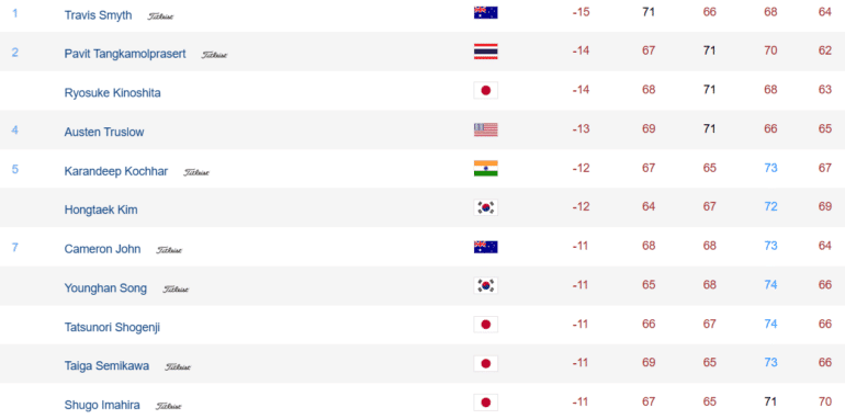 Grâce à un eagle sur le green du 18 du Caledonian Golf Club (par 71 de 6 516 mètres), l’Australien Travis Smyth coiffe sur le fil le Thaïlandais Pavit Tangkamolprasert et le Japonais Ryosuke Kinoshita. Auteur d’une dernière carte de 70 (-1), Julien Sale prend la 44e place finale à -4 (280).