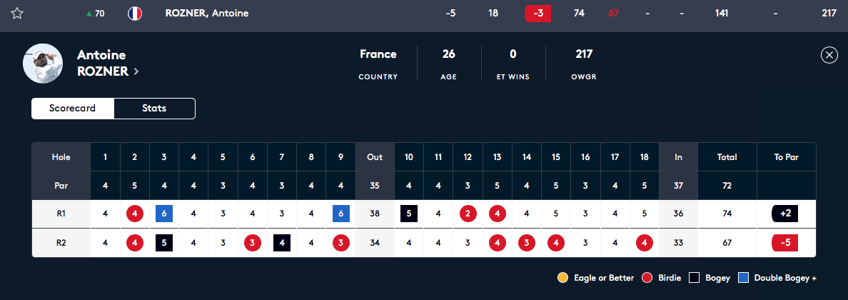 Mais ce vendredi, c’est un Français qui a rendu la plus belle carte du jour , soit 67. L’exploit sur ce parcours difficile dessiné par Gary Player revient à Antoine Rozner qui a fait sept birdies et deux bogeys.
