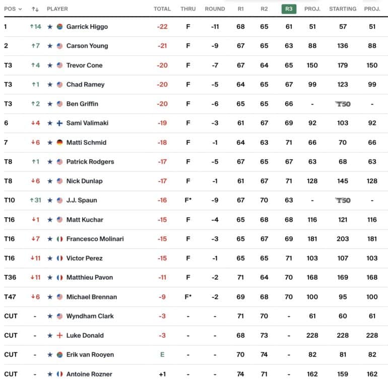 Pas concerné par ce classement général puisque bénéficiant d’une exemption courant jusqu’à fin 2026 sur le PGA Tour, Matthieu Pavon a fait suivre son 64 de la veille par un 70. Auteur de 4 birdies en 14 trous, le Girondin a trébuché sur le 15 enregistrant l’un des 14 double-bogeys ou plus recensés lors du troisième tour. Un seul birdie a été signé sur ce trou, il est l’oeuvre de l’Américain Trevor Cone.