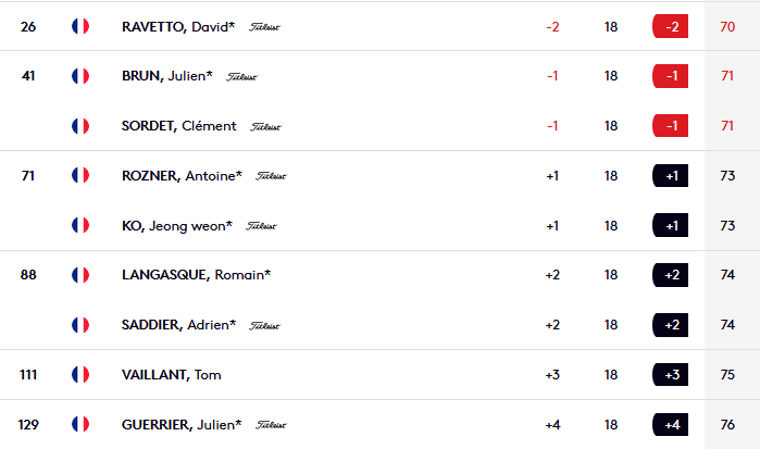 Un petit coup plus loin, Ugo Coussaud montre qu’il n’a rien perdu de sa grande forme pendant sa coupure. Le joueur de 31 ans revient à la compétition pour la première fois depuis sa deuxième place au Qatar il y a trois semaines. Ce jeudi, il est l’heureux signataire de quatre birdies et d’un eagle contre deux bogeys pour ouvrir par un 68 (-4), à la 8e place.