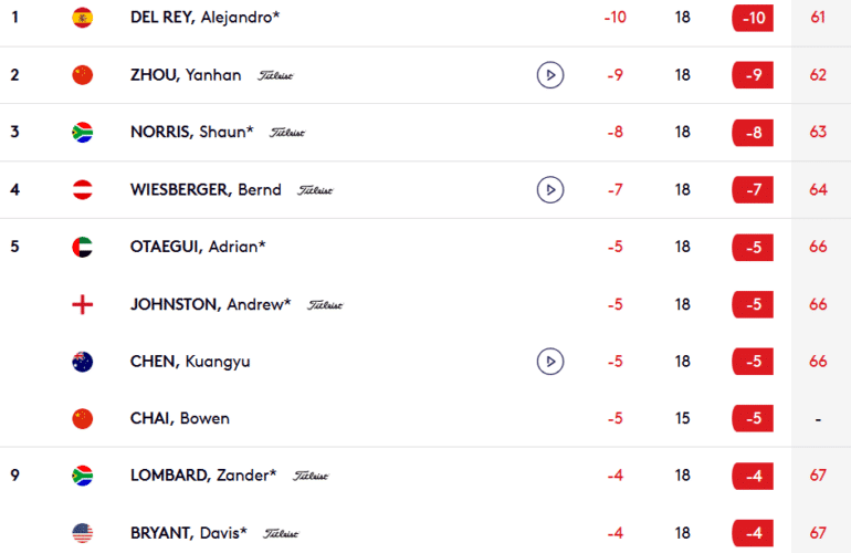 Ce duo haut en couleur est accompagné sur le podium par le vétéran (43 ans) sud-africain Shaun Norris, 63 (-8) aujourd’hui avec, comme pour Zhou, une journée sans la moindre erreur à l’horizon. Idem pour l’Autrichien Bernd Wiesberger, seul 4e à -7 (64).