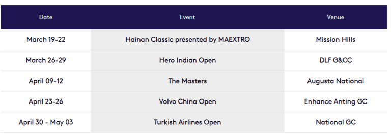 Cet Asian Swing comprend cinq tournois dans quatre pays différents : Hainan Classic, Hero Indian Open, Masters, Volvo China Open et Turkish Airlines Open. Le Masters ne compte toutefois pas dans le classement final mais permet cependant l’obtention de précieux points pour le classement de la Race to Dubaï.