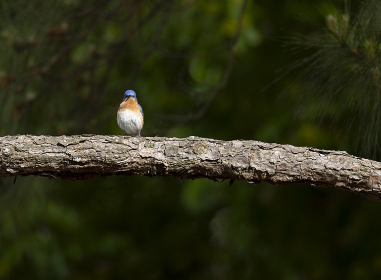 Renseignements pris, ce sont des Merles bleus de l’Est (photo), des Moqueurs polyglottes et des Cardinaux rouges qui assurent cette ambiance bucolique. Les ornithologues apprécieront.