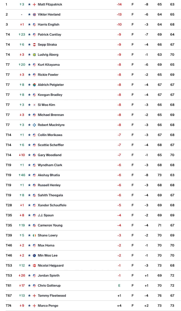 Un score que seul Akshay Bhatia, qui a pourtant concédé un double bogey, a réussi à égaler. Il a signé pas moins de 11 birdies, Sahith Theegala s’illustrant pour sa part en signant deux eagles dont un sur une approche rentrée sur le par 4 du 16.