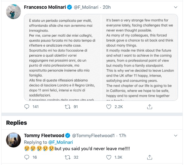 Après 11 ans passés à Londres l’Italien Francesco Molinari a annoncé sur les réseaux sociaux que lui et sa famille déménageraient aux États-Unis. Faut-il y voir un nouveau coup d’arrêt pour l’European Tour ?
