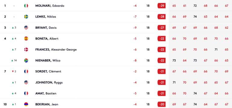Longtemps deuxième, Clément Sordet a manqué de gaz et lâché du terrain lors du cinquième tour avec une carte de 70 (-1) entachée de son seul double bogey de la semaine, suivie d’une dernière carte de 69 (-2). Il boucle le tournoi à la septième place (-21 total), en compagnie de Bastien Amat qui a, lui, affiché un visage différent : après une troisième carte de 74 (+2), le néo-pro a passé le cut grâce à une carte de 67 (-4) et rendu deux dernières belles copies : 64 (-7) et 66 (-5).